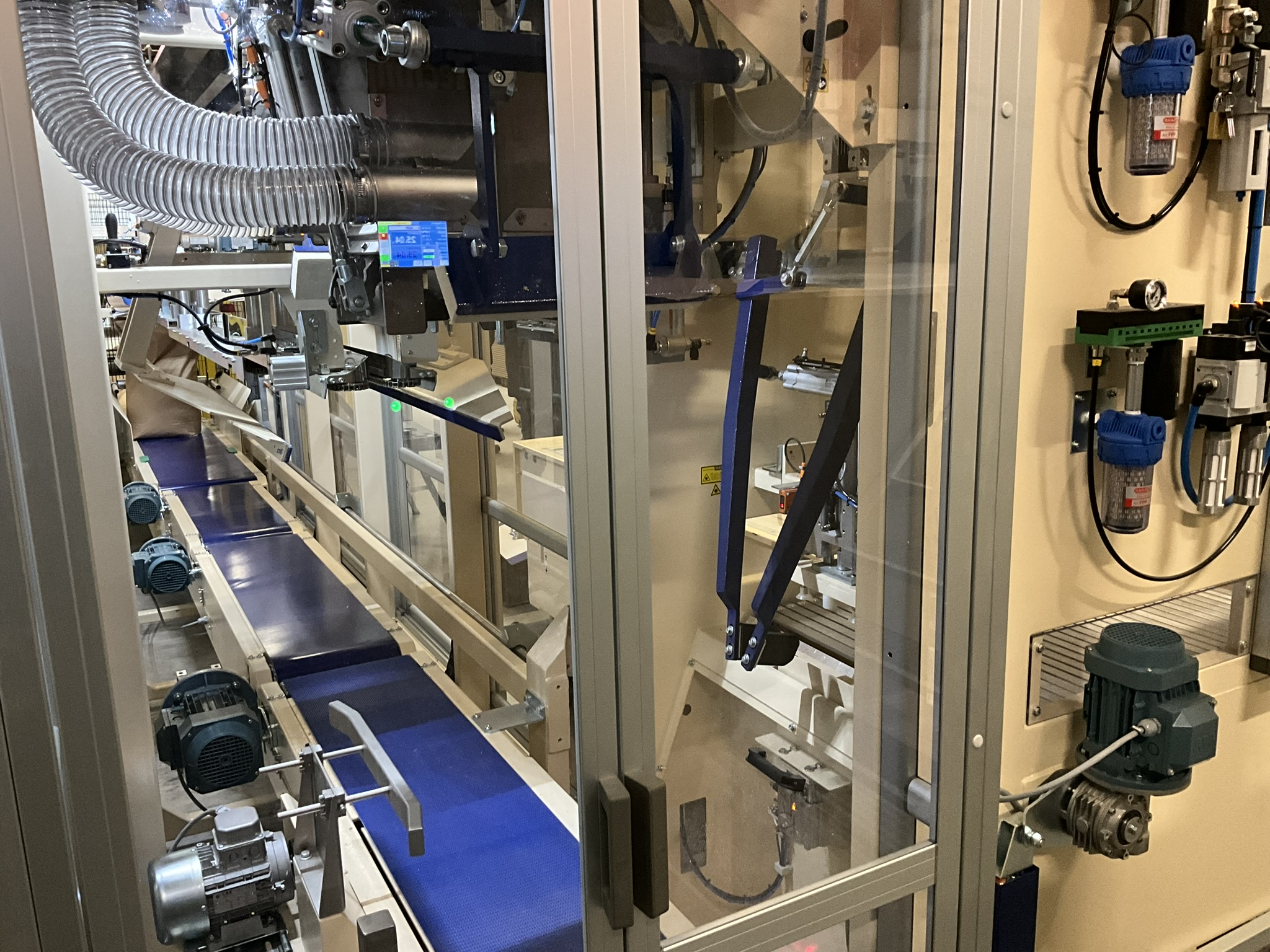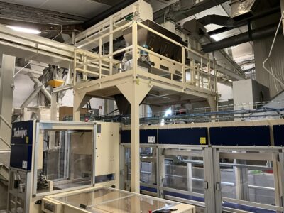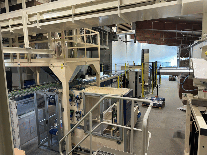 Vroeger werkte Agri V met een semi-automatische afzakinstallatie, waarbij een operator elke papieren zak (van 10 kg tot 25 kg) handmatig moest aansteken. De zakken werden vervolgens automatisch gestapeld op een pallet. Vandaag is dat volledig anders. De nieuwe lijn verwerkt 6 tot 7 zakken per minuut – tegenover 2,5 zakken vroeger – en dat met slechts een halve operator.